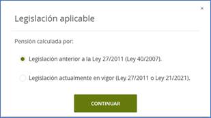 Debe tenerse en cuenta que cada vez que se modifiquen alguna de estas condiciones personales, el simulador realizará un nuevo cálculo como ocurría hasta ahora; es decir, volverá a resolver por ley antigua (si existe derecho) y aparecerá de nuevo el bloque de “legislación aplicable” para que se realice, si se desea, el cálculo por la legislación actualmente en vigor.