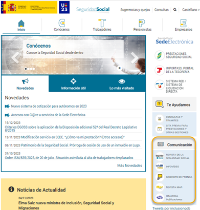El acceso al nuevo Portal se encuentra en el apartado de Comunicación de la página web, como se muestra a continuación, y a través de la dirección: https://infovideo.seg-social.es.