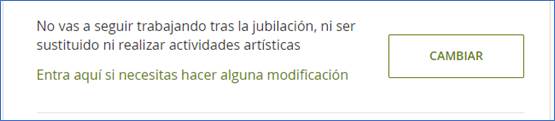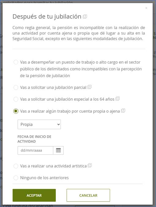 Por tanto, se recuerda que, en estos casos, es necesario marcar en el apartado de “Situaciones personales” que se va a continuar trabajando tras la jubilación; seleccionar la opción “Voy a realizar algún trabajo por cuenta propia o ajena” e indicar el tipo de actividad que se va a realizar (cuenta propia o ajena), la fecha de inicio, y en su caso, el porcentaje de jornada realizado.