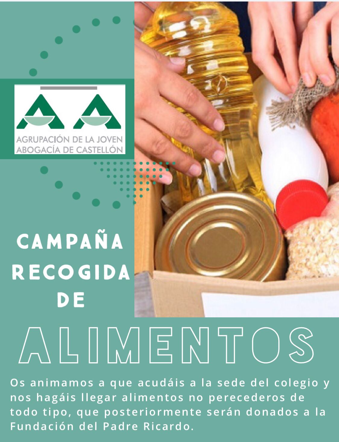 Desde la Agrupación de Jóvenes Abogados deseamos fomentar una iniciativa dirigida a los más desfavorecidos, por todo ello os animamos a que acudáis a la sede del colegio y nos hagáis llegar alimentos no perecederos de todo tipo, que posteriormente serán donados a la Fundación del Padre Ricardo, podéis participar hasta el día 5/1/2024.